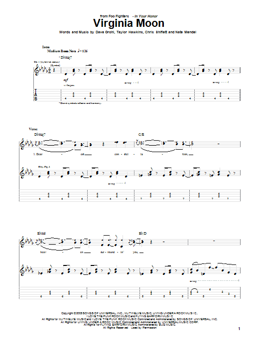Download or print Foo Fighters Virginia Moon sheet music, chords and digital score arranged for Guitar Tab. This Alternative score includes 6 page(s).