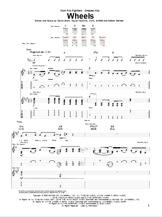 Download or print Foo Fighters Wheels sheet music, chords and digital score arranged for Guitar Tab. This Pop score includes 7 page(s).