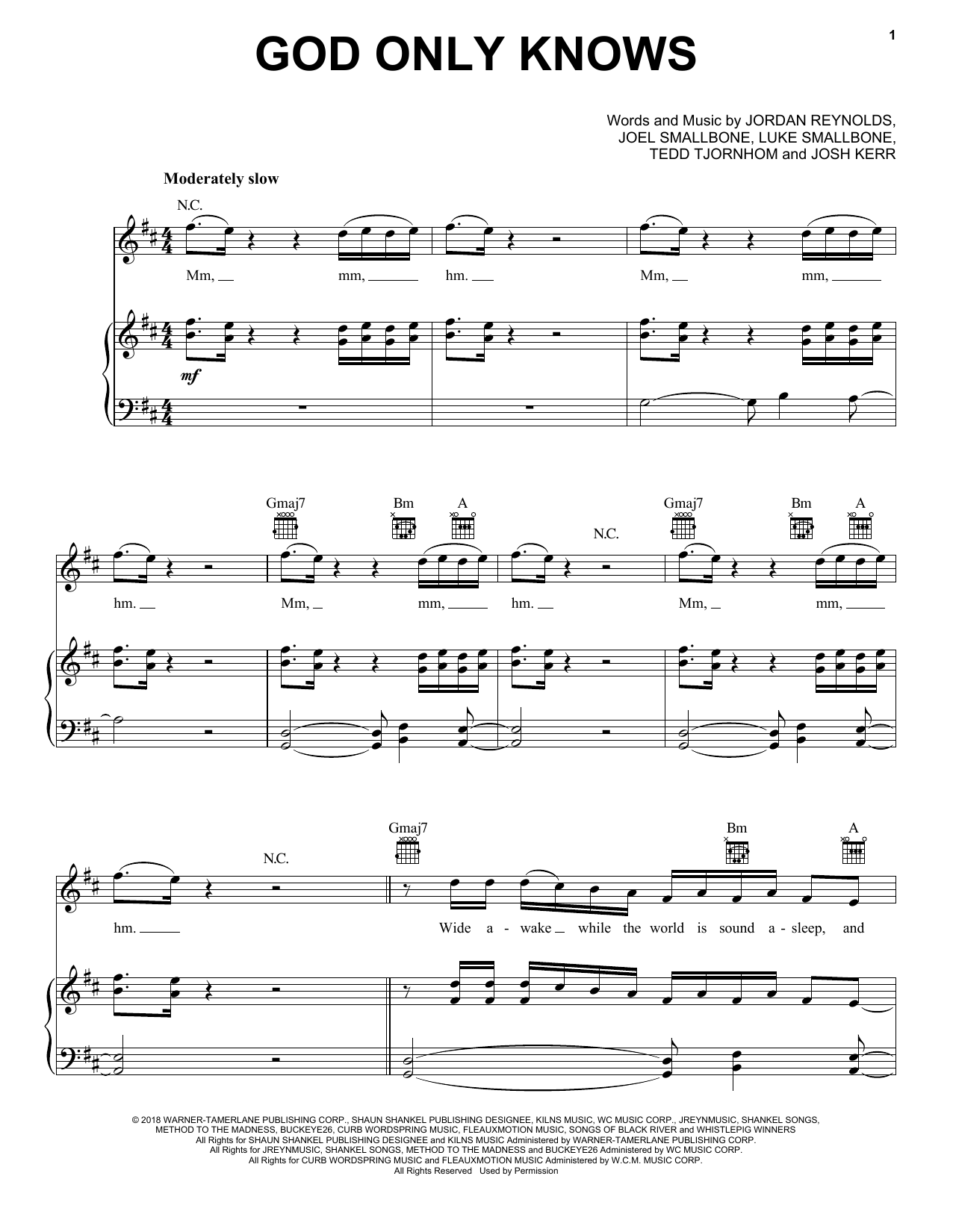 Download or print for KING & COUNTRY God Only Knows sheet music, chords and digital score arranged for Piano, Vocal & Guitar Chords (Right-Hand Melody). This Pop score includes 7 page(s).