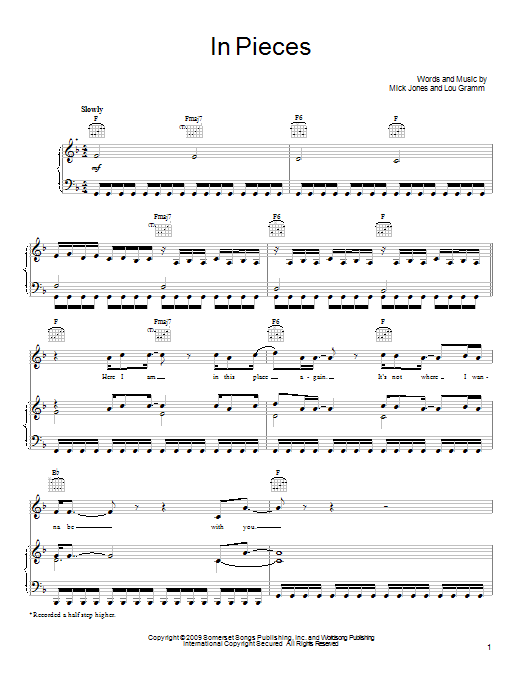 Download or print Foreigner In Pieces sheet music, chords and digital score arranged for Piano, Vocal & Guitar Chords (Right-Hand Melody). This Pop score includes 7 page(s).