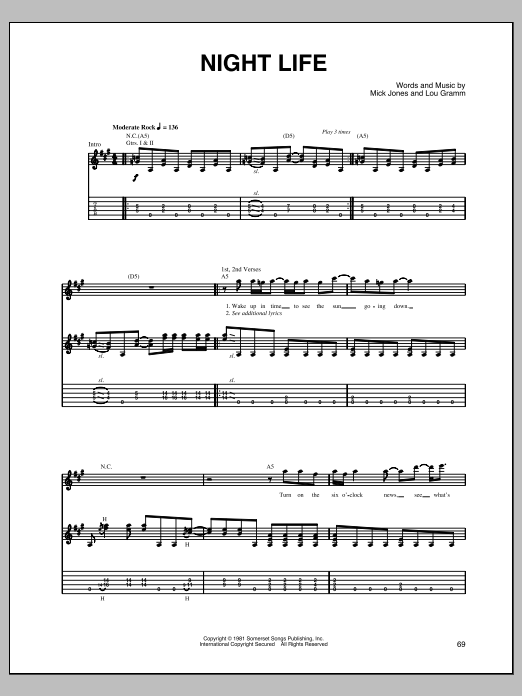 Download or print Foreigner Night Life sheet music, chords and digital score arranged for Guitar Tab. This Pop score includes 9 page(s).