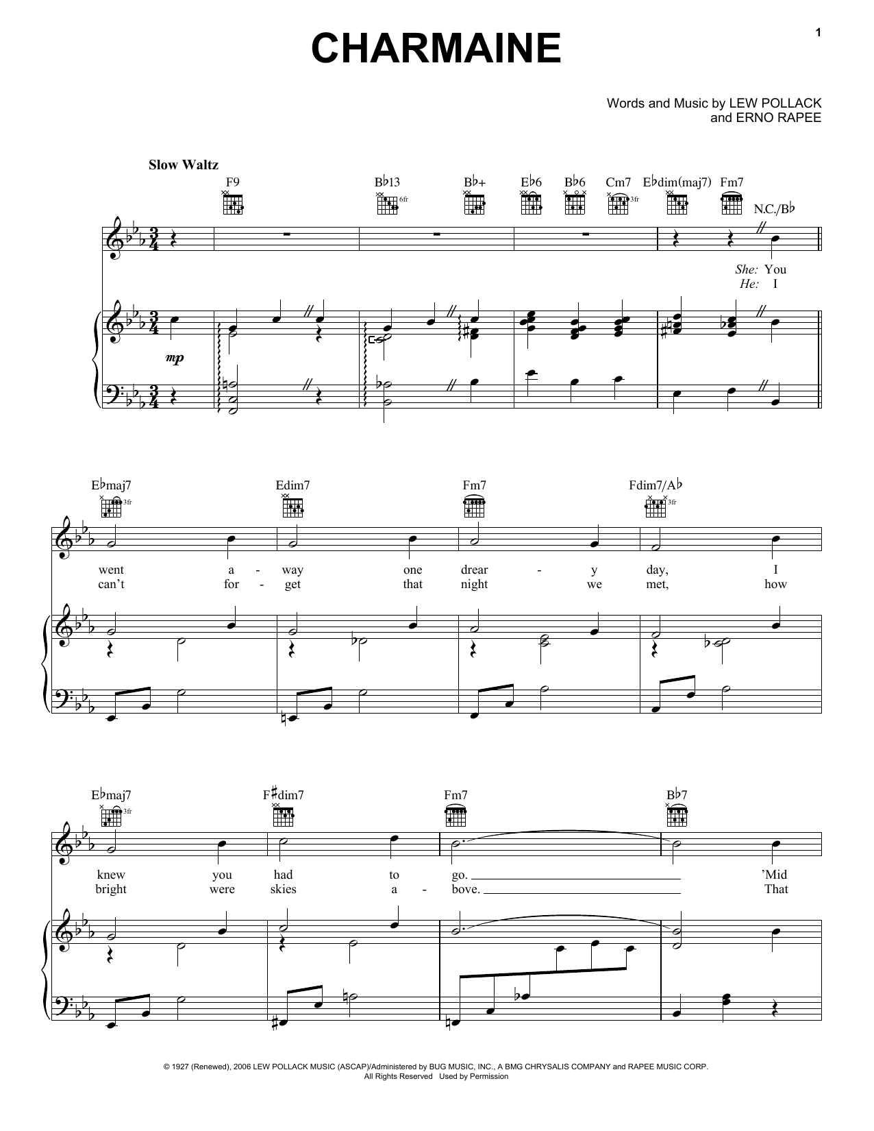 Download or print Four Freshman Charmaine sheet music, chords and digital score arranged for Piano, Vocal & Guitar Chords (Right-Hand Melody). This Pop score includes 4 page(s).
