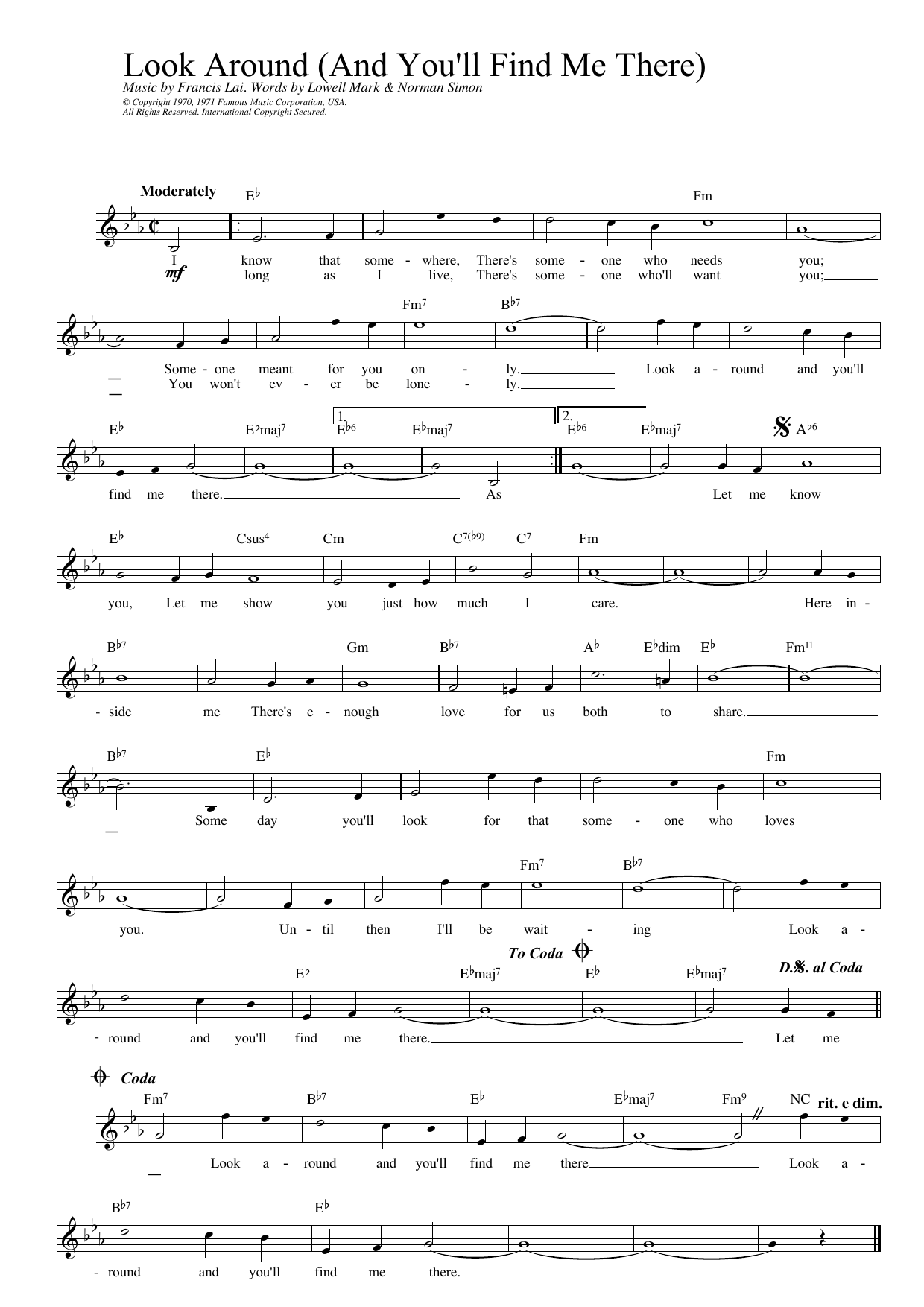 Download or print Francis Lai Look Around (And You'll Find Me There) (from Love Story) sheet music, chords and digital score arranged for Lead Sheet / Fake Book. This Film/TV score includes 2 page(s).