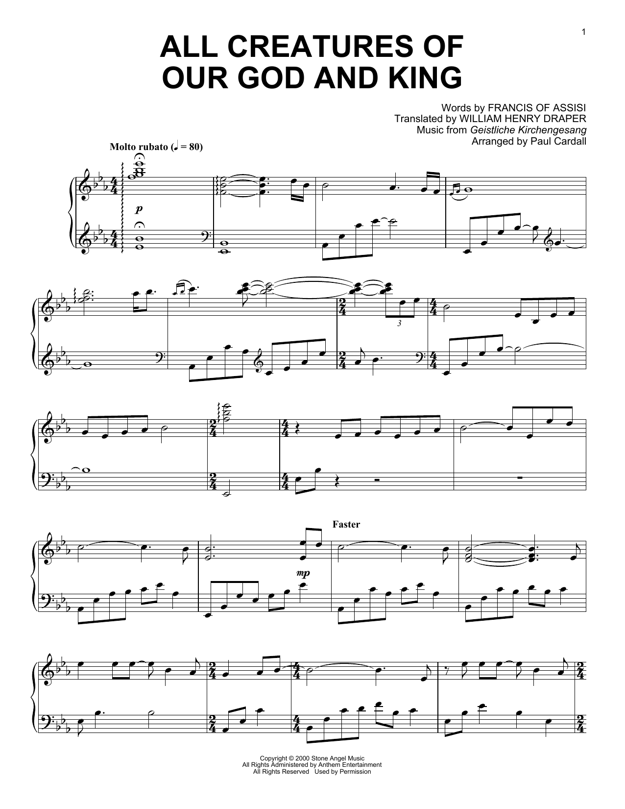Download or print Francis Of Assisi All Creatures Of Our God And King (arr. Paul Cardall) sheet music, chords and digital score arranged for Piano Solo. This Gospel score includes 3 page(s).