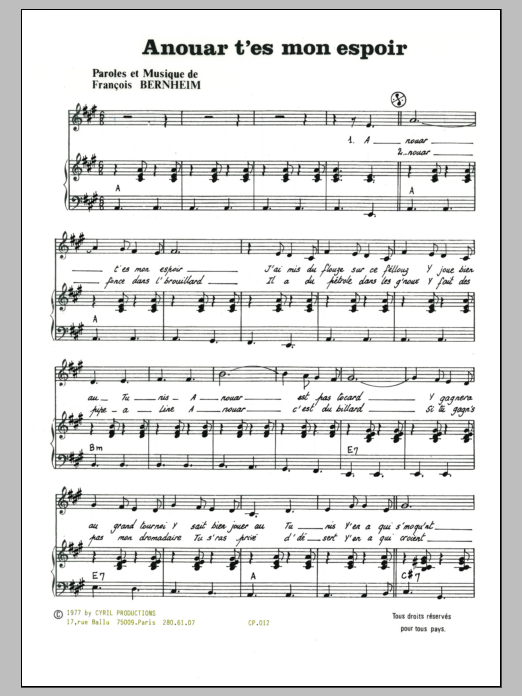 Download or print Francois Bernheim Ainhouar T'es Mon Espoir sheet music, chords and digital score arranged for Piano & Vocal. This Pop score includes 2 page(s).