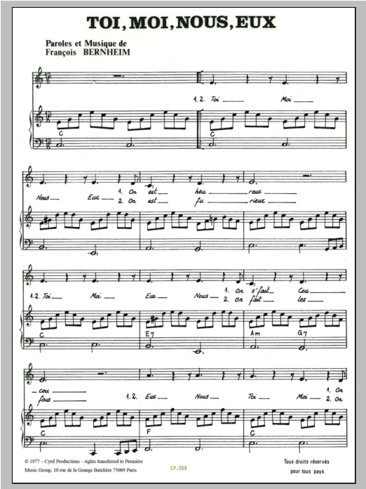 Download or print Francois Bernheim Toi, Moi, Nous, Eux sheet music, chords and digital score arranged for Piano & Vocal. This French score includes 2 page(s).