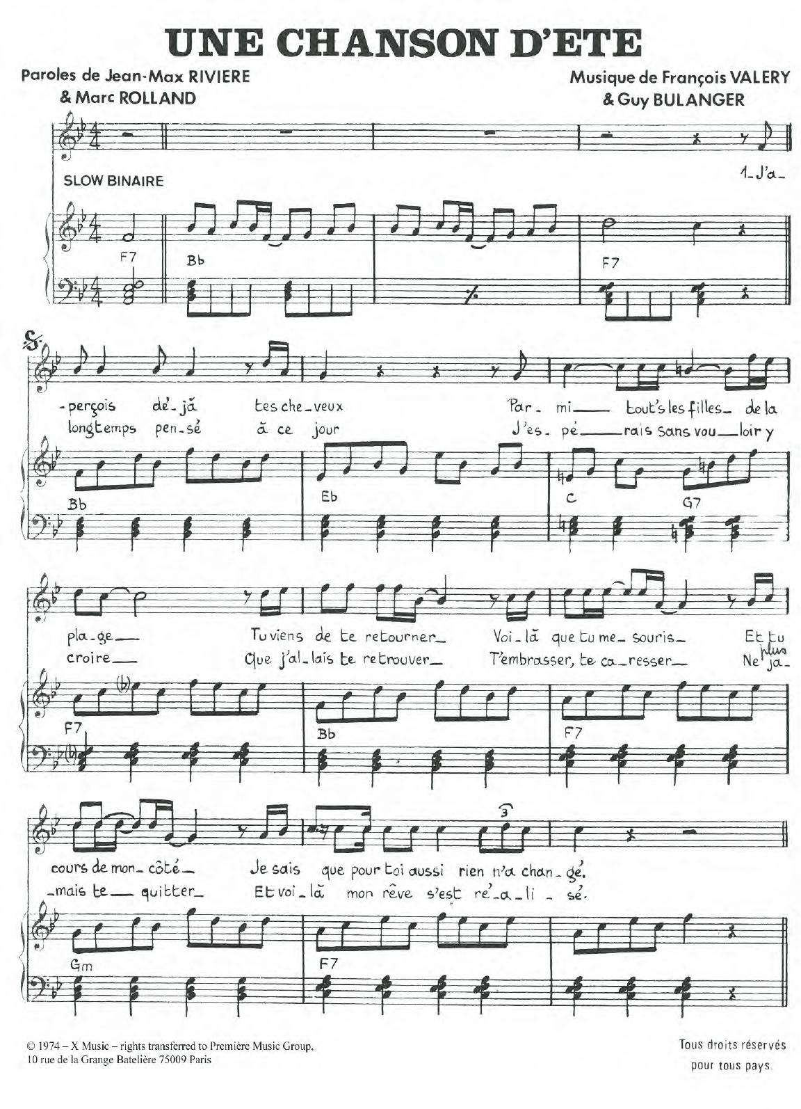 Download or print Francois Valery Une Chanson D'ete sheet music, chords and digital score arranged for Piano & Vocal. This Pop score includes 2 page(s).