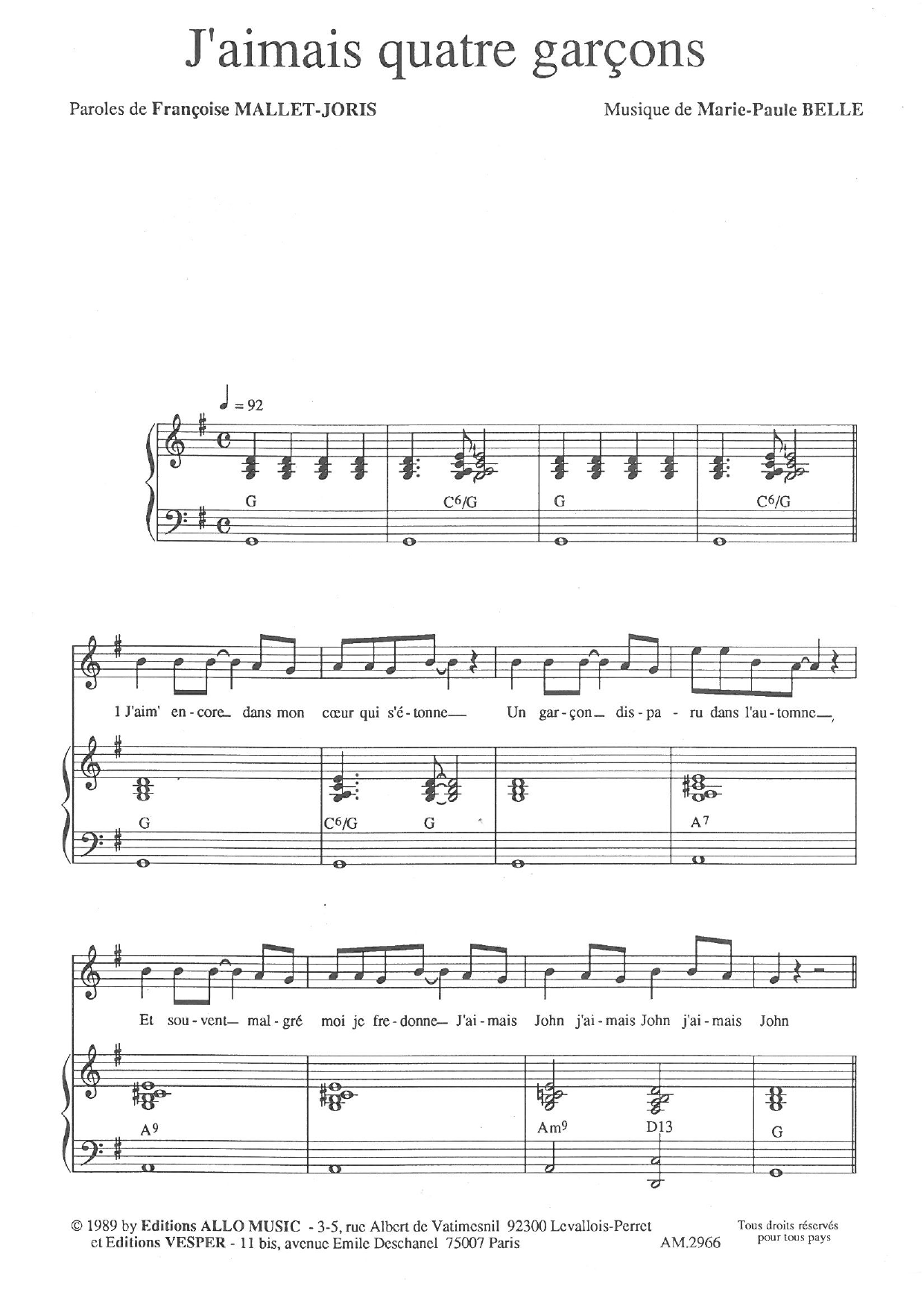Download or print Françoise Mallet-Joris and Marie Paule Belle J'aimais Quatre Garçons sheet music, chords and digital score arranged for Piano & Vocal. This Classical score includes 3 page(s).