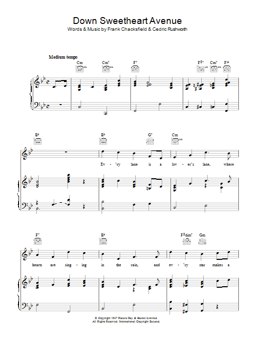 Download or print Frank Chacksfield Down Sweetheart Avenue sheet music, chords and digital score arranged for Piano, Vocal & Guitar Chords. This Standards score includes 4 page(s).