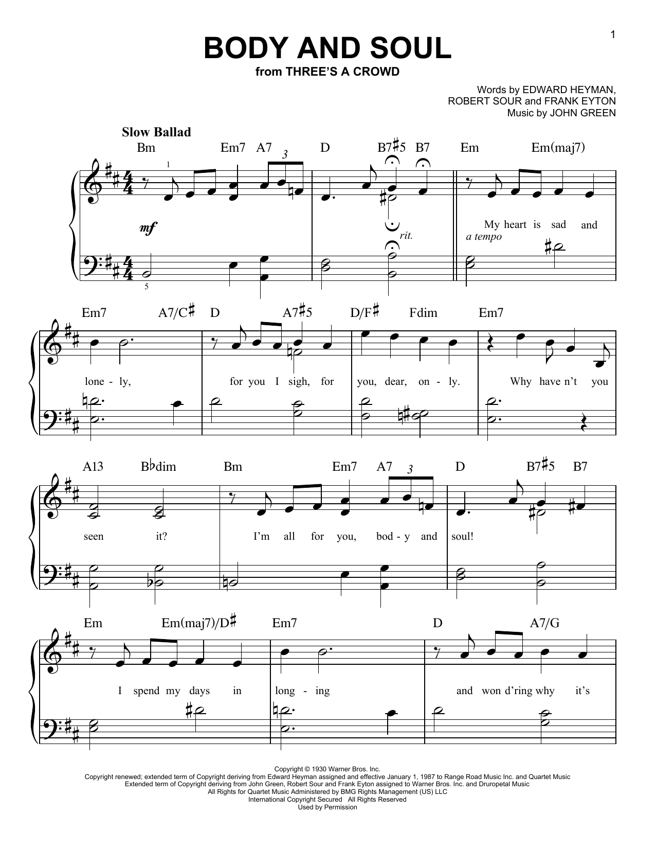 Download or print Frank Eyton Body And Soul sheet music, chords and digital score arranged for Very Easy Piano. This Jazz score includes 3 page(s).