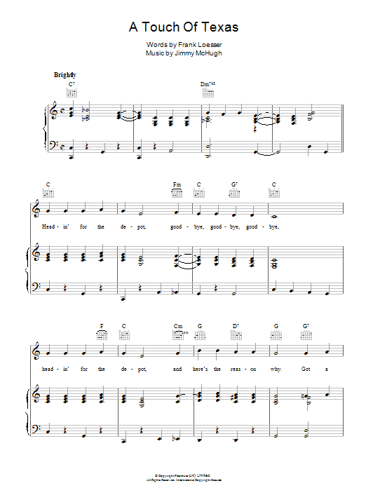 Download or print Frank Loesser A Touch Of Texas sheet music, chords and digital score arranged for Piano, Vocal & Guitar Chords. This Standards score includes 6 page(s).