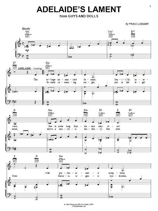 Download or print Frank Loesser Adelaide's Lament (from Guys And Dolls) sheet music, chords and digital score arranged for Piano & Vocal. This Musical/Show score includes 4 page(s).