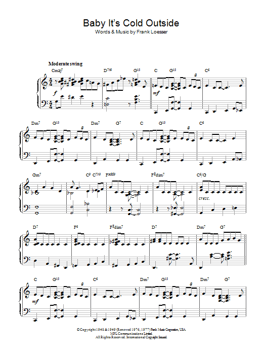 Download or print Frank Loesser Baby, It's Cold Outside sheet music, chords and digital score arranged for Piano Solo. This Christmas score includes 4 page(s).