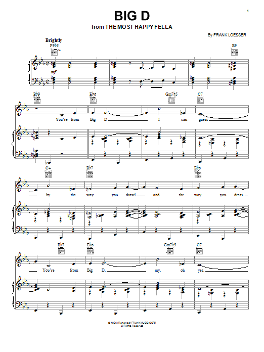 Download or print Frank Loesser Big D sheet music, chords and digital score arranged for Piano, Vocal & Guitar Chords. This Musical/Show score includes 4 page(s).