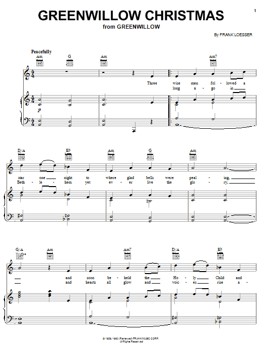 Download or print Frank Loesser Greenwillow Christmas sheet music, chords and digital score arranged for Piano, Vocal & Guitar Chords (Right-Hand Melody). This Christmas score includes 3 page(s).