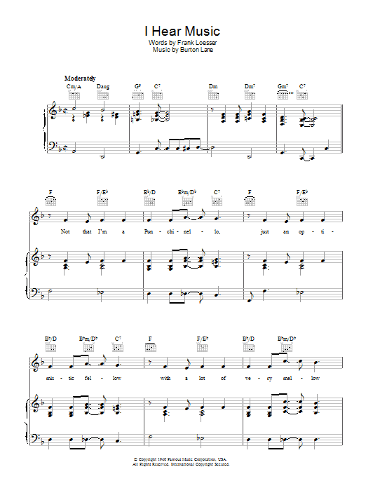 Download or print Frank Loesser I Hear Music sheet music, chords and digital score arranged for Piano, Vocal & Guitar Chords (Right-Hand Melody). This Jazz score includes 4 page(s).