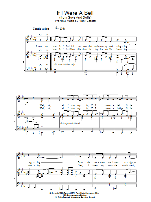 Download or print Frank Loesser If I Were A Bell sheet music, chords and digital score arranged for Real Book – Melody, Lyrics & Chords. This Jazz score includes 1 page(s).