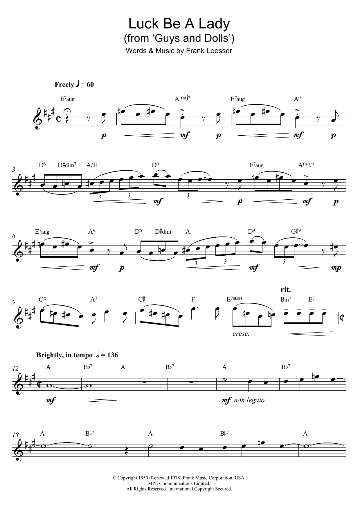 Download or print Frank Loesser Luck Be A Lady (from 'Guys and Dolls') sheet music, chords and digital score arranged for Piano & Vocal. This Musical/Show score includes 4 page(s).