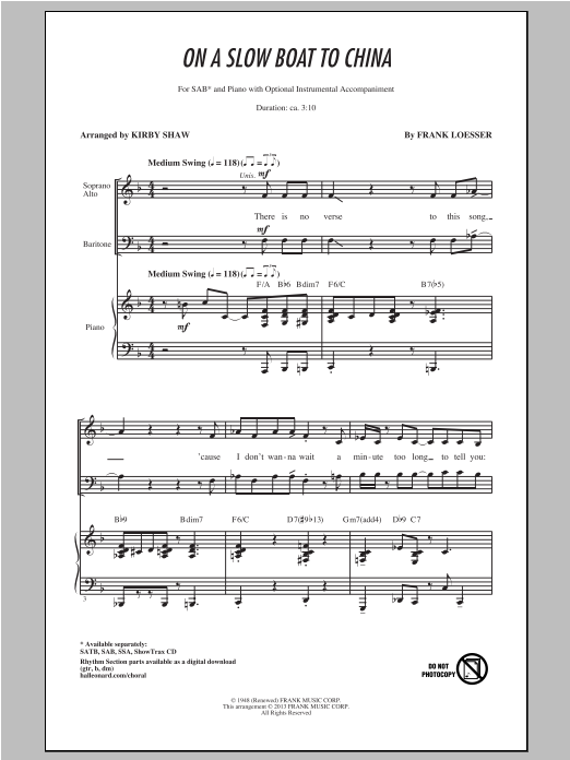 Download or print Kirby Shaw On A Slow Boat To China sheet music, chords and digital score arranged for SSA Choir. This Standards score includes 1 page(s).