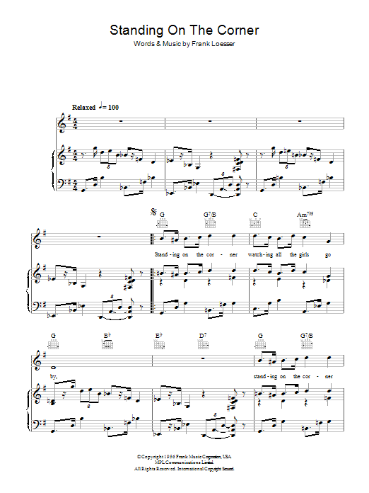 Download or print Frank Loesser Standing On The Corner sheet music, chords and digital score arranged for Piano, Vocal & Guitar Chords. This Standards score includes 4 page(s).