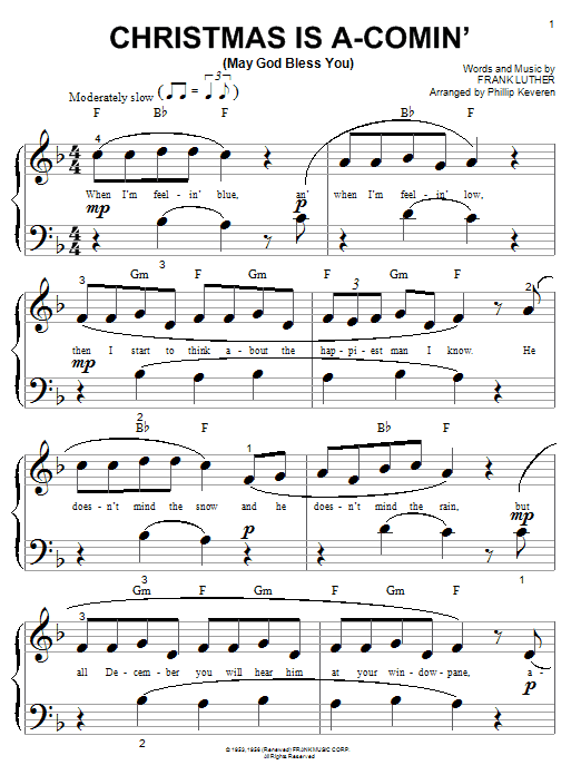 Download or print Frank Luther Christmas Is A-Comin' (May God Bless You) (arr. Phillip Keveren) sheet music, chords and digital score arranged for Beginning Piano Solo. This Children score includes 4 page(s).