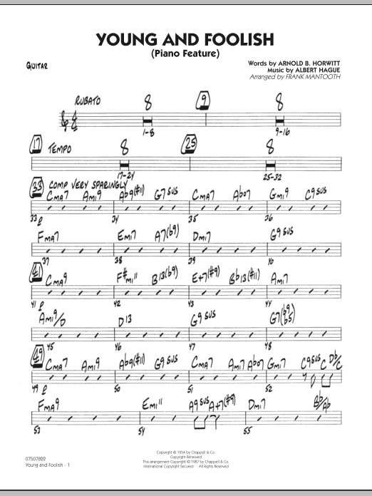 Download or print Frank Mantooth Young And Foolish - Guitar sheet music, chords and digital score arranged for Jazz Ensemble. This Jazz score includes 2 page(s).