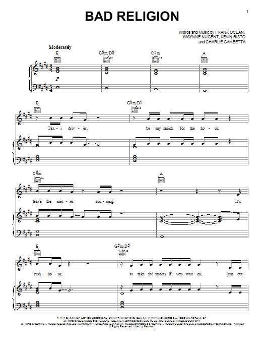 Download or print Frank Ocean Bad Religion sheet music, chords and digital score arranged for Piano, Vocal & Guitar Chords (Right-Hand Melody). This Pop score includes 7 page(s).