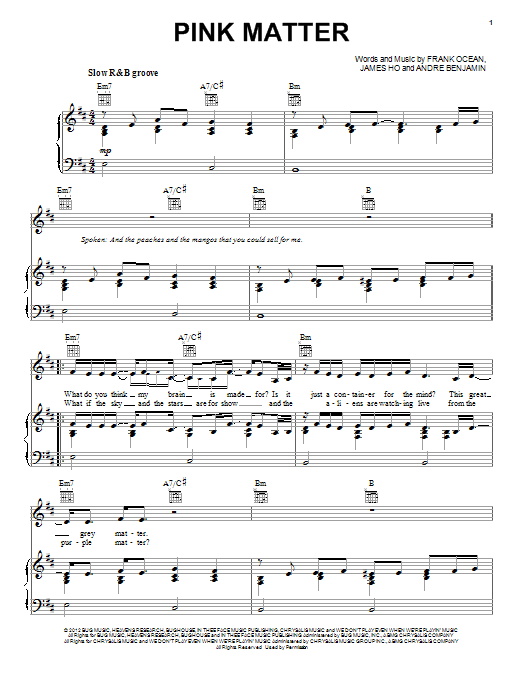 Download or print Frank Ocean Pink Matter sheet music, chords and digital score arranged for Piano, Vocal & Guitar Chords (Right-Hand Melody). This Pop score includes 6 page(s).
