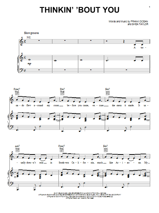 Download or print Frank Ocean Thinkin' 'Bout You sheet music, chords and digital score arranged for Piano, Vocal & Guitar Chords (Right-Hand Melody). This Pop score includes 7 page(s).