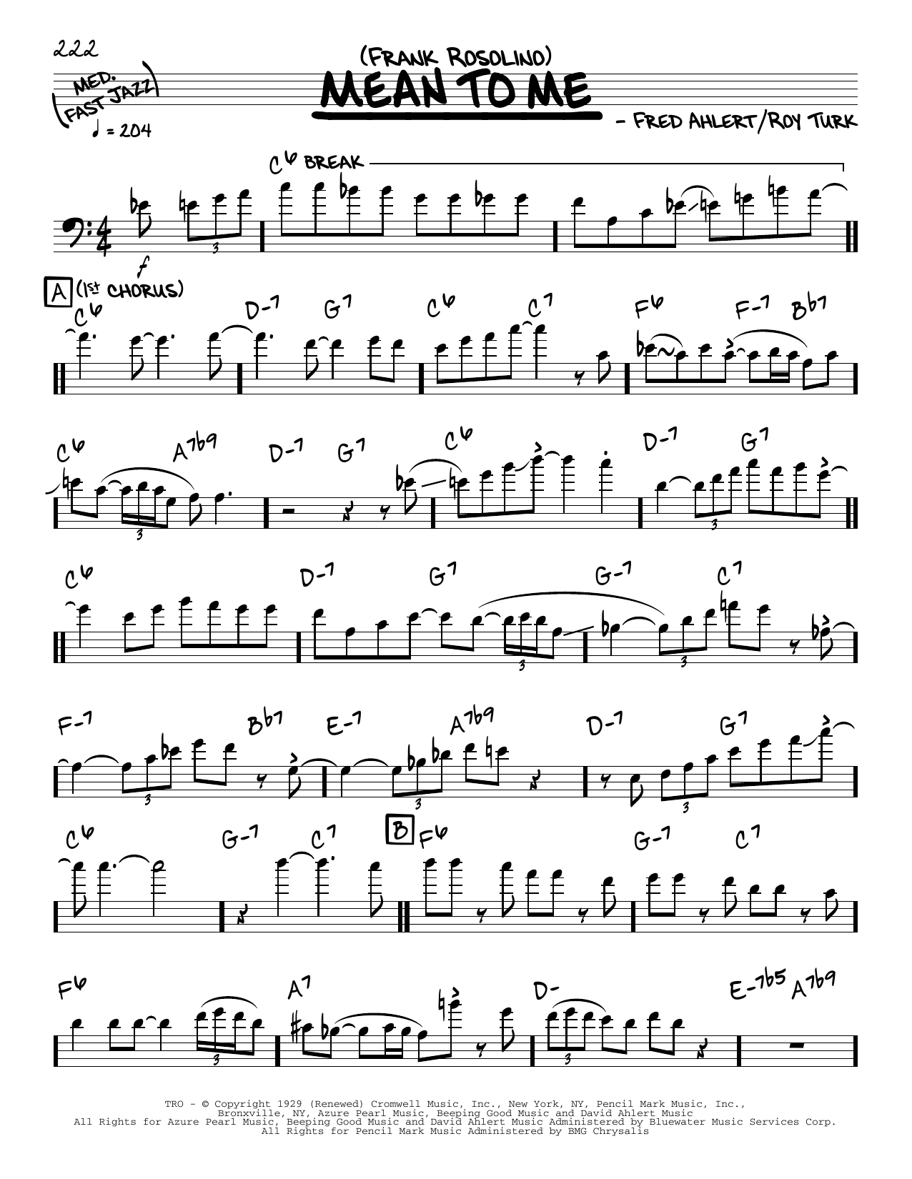 Download or print Frank Rosolino Mean To Me (solo only) sheet music, chords and digital score arranged for Real Book – Melody & Chords. This Jazz score includes 3 page(s).