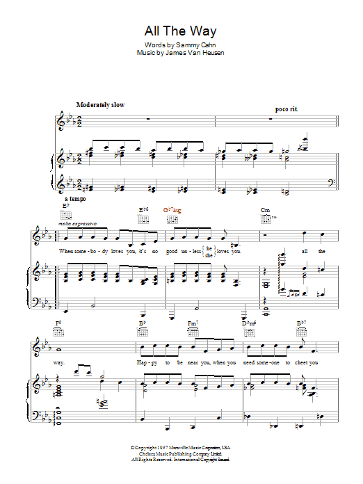 Download or print Frank Sinatra All The Way sheet music, chords and digital score arranged for Piano, Vocal & Guitar Chords (Right-Hand Melody). This Film/TV score includes 2 page(s).