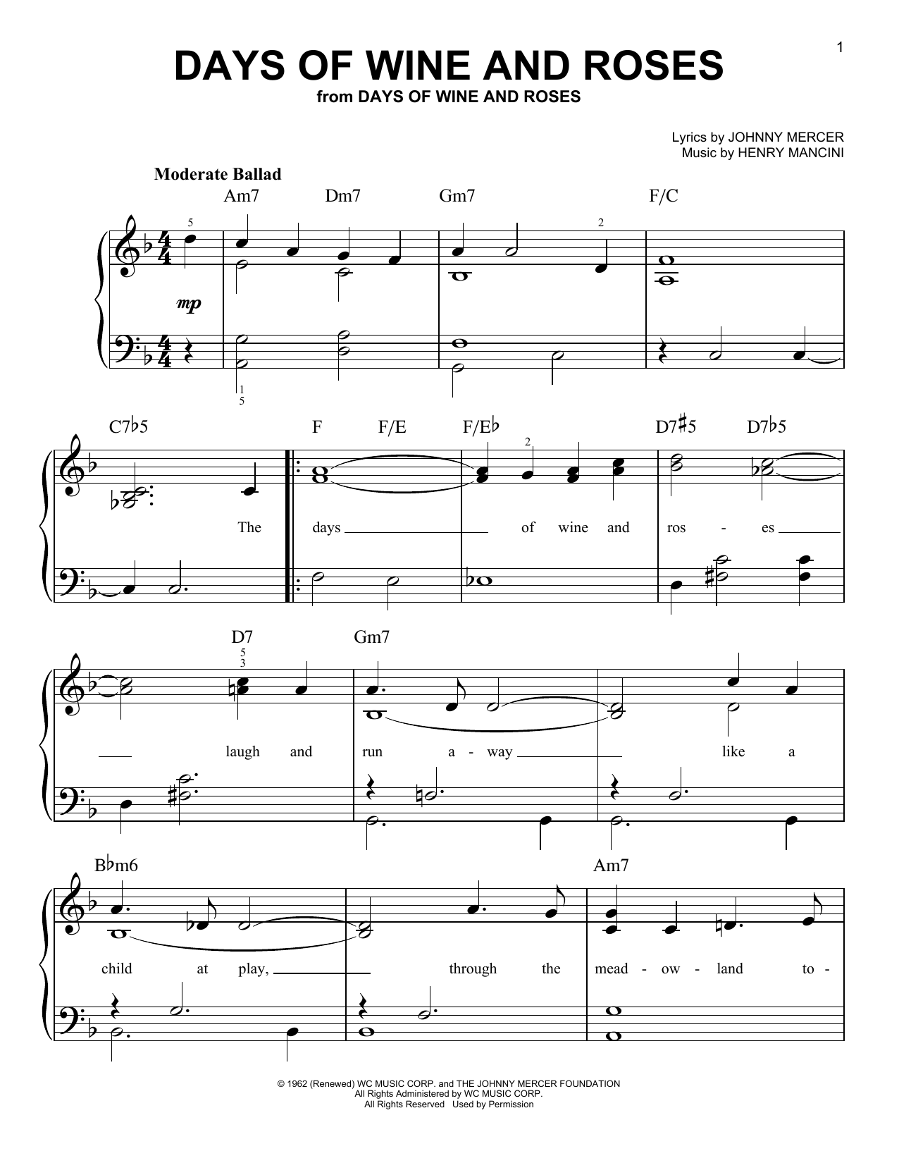 Download or print Henry Mancini Days Of Wine And Roses sheet music, chords and digital score arranged for Piano, Vocal & Guitar Chords (Right-Hand Melody). This Jazz score includes 2 page(s).