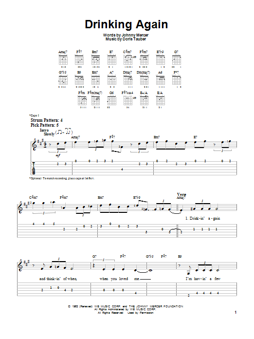 Download or print Frank Sinatra Drinking Again sheet music, chords and digital score arranged for Piano, Vocal & Guitar Chords (Right-Hand Melody). This Jazz score includes 3 page(s).