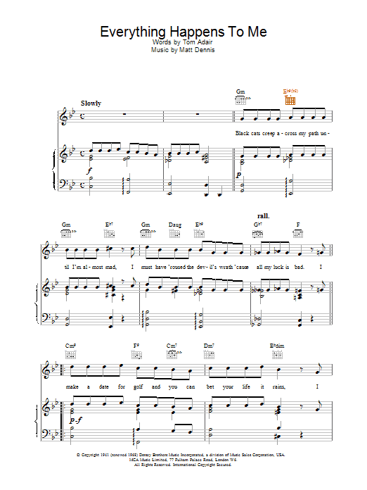 Download or print Frank Sinatra Everything Happens To Me sheet music, chords and digital score arranged for Piano, Vocal & Guitar Chords. This Jazz score includes 4 page(s).
