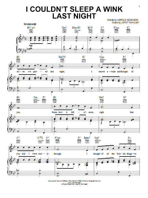 Download or print Frank Sinatra I Couldn't Sleep A Wink Last Night sheet music, chords and digital score arranged for Piano, Vocal & Guitar Chords (Right-Hand Melody). This Jazz score includes 3 page(s).