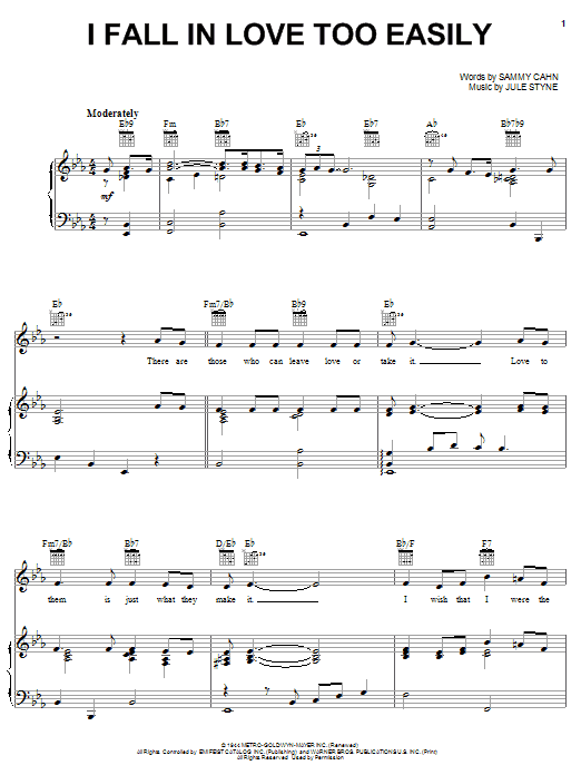 Download or print Frank Sinatra I Fall In Love Too Easily sheet music, chords and digital score arranged for Piano, Vocal & Guitar Chords. This Standards score includes 2 page(s).