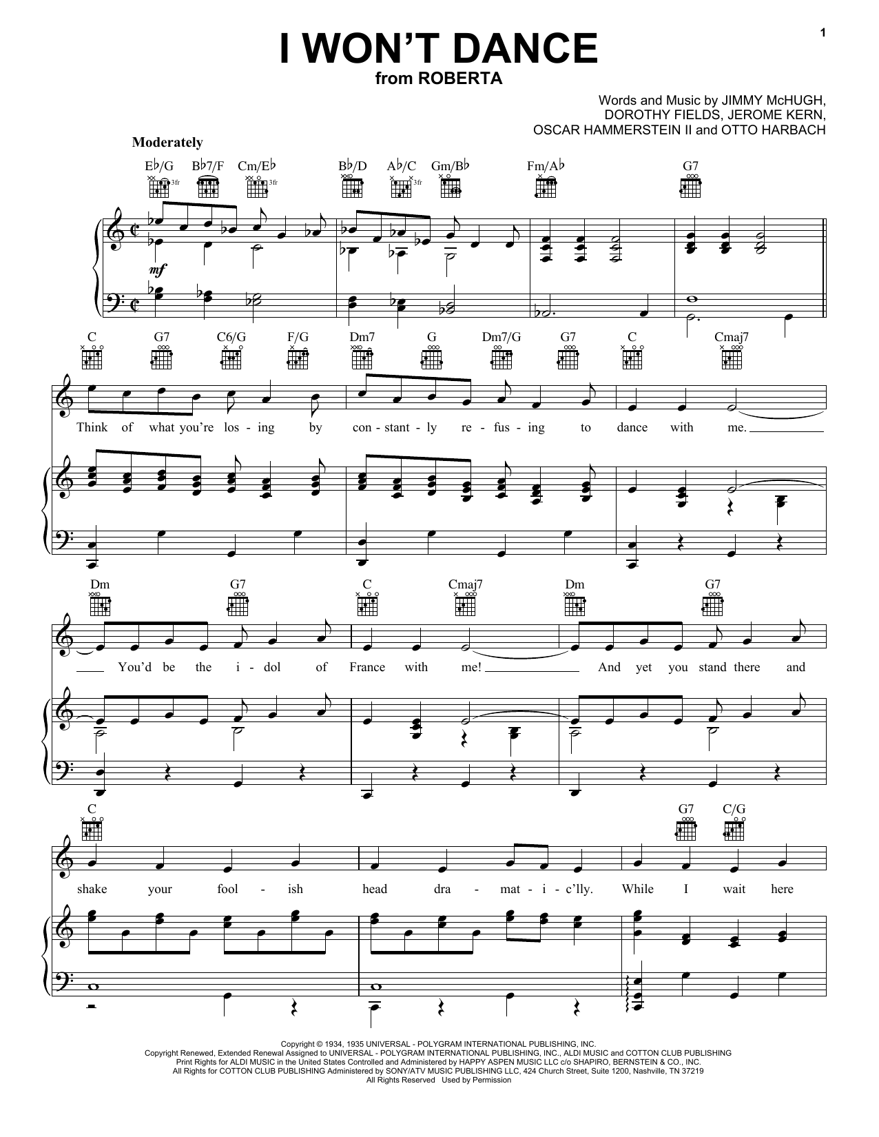 Download or print Frank Sinatra I Won't Dance sheet music, chords and digital score arranged for Piano, Vocal & Guitar Chords (Right-Hand Melody). This Jazz score includes 6 page(s).