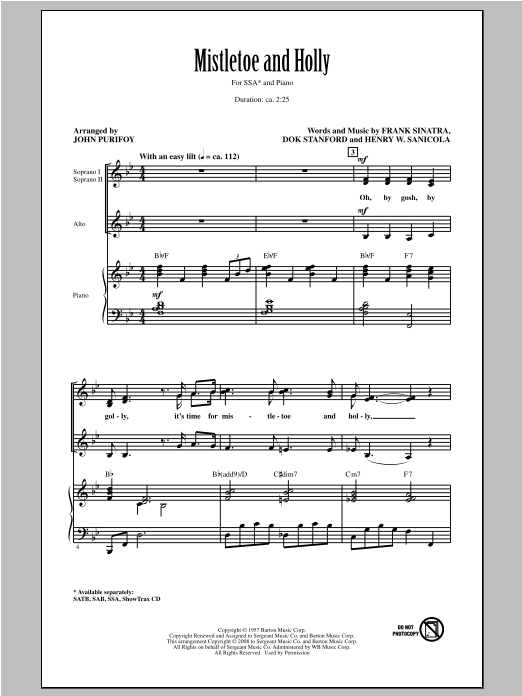 Download or print John Purifoy Mistletoe And Holly sheet music, chords and digital score arranged for SSA Choir. This Christmas score includes 7 page(s).