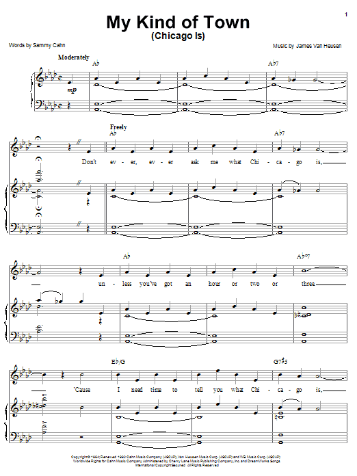 Download or print Frank Sinatra My Kind Of Town (Chicago Is) sheet music, chords and digital score arranged for Piano, Vocal & Guitar Chords (Right-Hand Melody). This Jazz score includes 5 page(s).