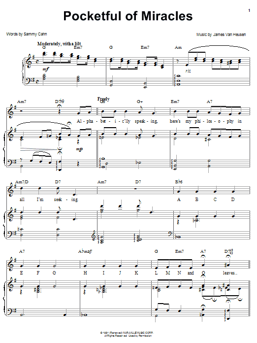 Download or print Frank Sinatra Pocketful Of Miracles sheet music, chords and digital score arranged for Piano, Vocal & Guitar Chords (Right-Hand Melody). This Jazz score includes 5 page(s).