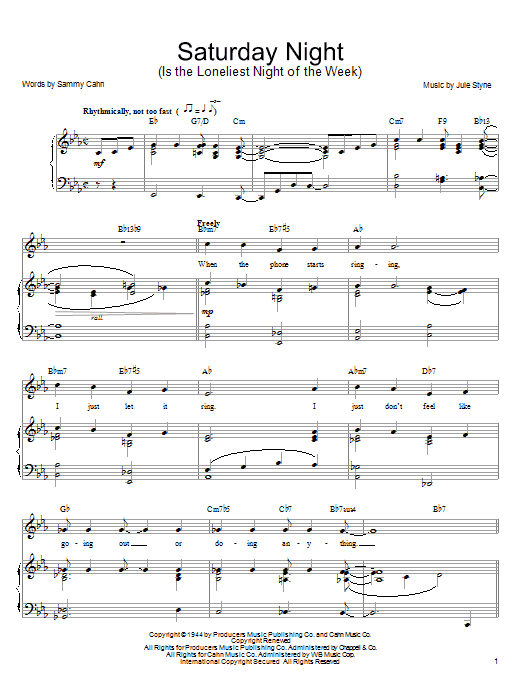 Download or print Frank Sinatra Saturday Night (Is The Loneliest Night Of The Week) sheet music, chords and digital score arranged for Piano, Vocal & Guitar Chords (Right-Hand Melody). This Jazz score includes 4 page(s).