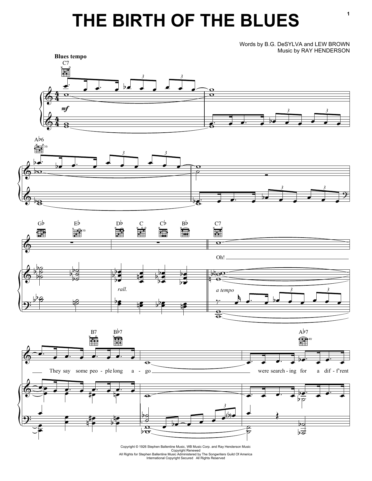 Download or print Frank Sinatra The Birth Of The Blues sheet music, chords and digital score arranged for Piano & Vocal. This Blues score includes 5 page(s).