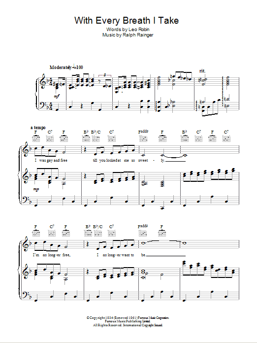 Download or print Frank Sinatra With Every Breath I Take sheet music, chords and digital score arranged for Piano, Vocal & Guitar Chords. This Standards score includes 4 page(s).