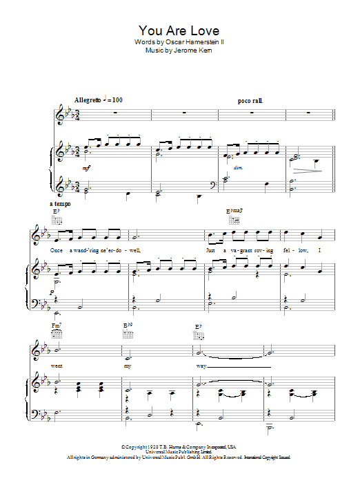 Download or print Rodgers & Hammerstein You Are Love sheet music, chords and digital score arranged for Piano, Vocal & Guitar Chords. This Film/TV score includes 7 page(s).