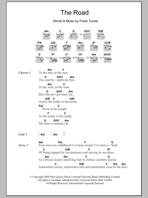 Download or print Frank Turner The Road sheet music, chords and digital score arranged for Guitar Chords/Lyrics. This Rock score includes 3 page(s).
