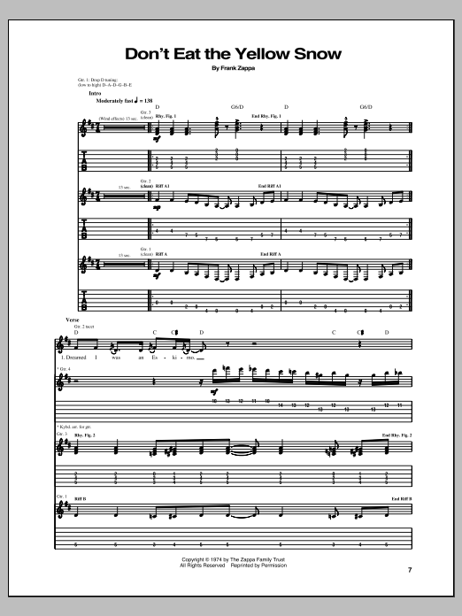 Download or print Frank Zappa Don't Eat The Yellow Snow sheet music, chords and digital score arranged for Guitar Tab. This Pop score includes 4 page(s).
