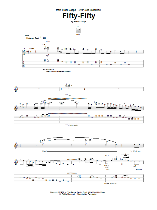 Download or print Frank Zappa Fifty-Fifty sheet music, chords and digital score arranged for Guitar Tab. This Pop score includes 15 page(s).