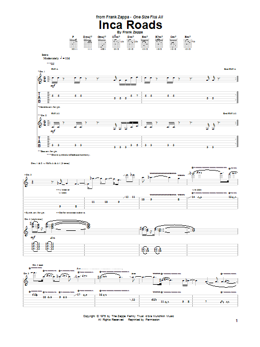 Download or print Frank Zappa Inca Roads sheet music, chords and digital score arranged for Guitar Tab. This Pop score includes 34 page(s).