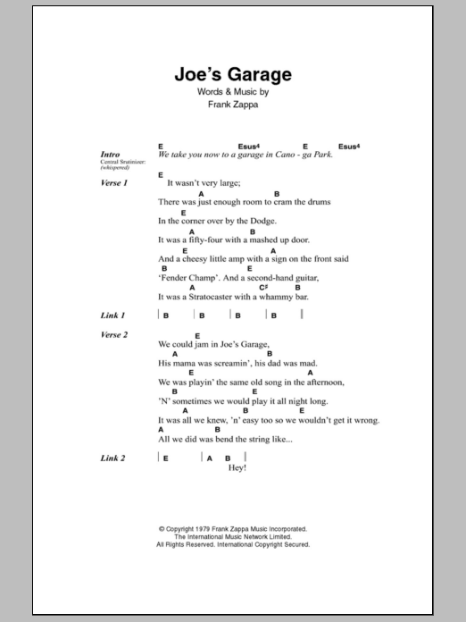 Download or print Frank Zappa Joe's Garage sheet music, chords and digital score arranged for Guitar Chords/Lyrics. This Rock score includes 5 page(s).