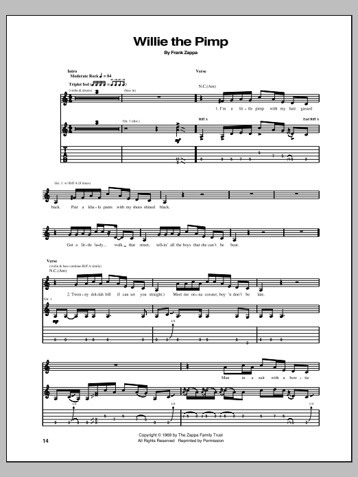 Download or print Frank Zappa Willie The Pimp sheet music, chords and digital score arranged for Guitar Tab. This Pop score includes 16 page(s).